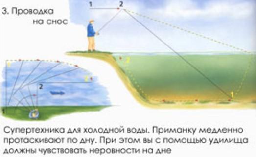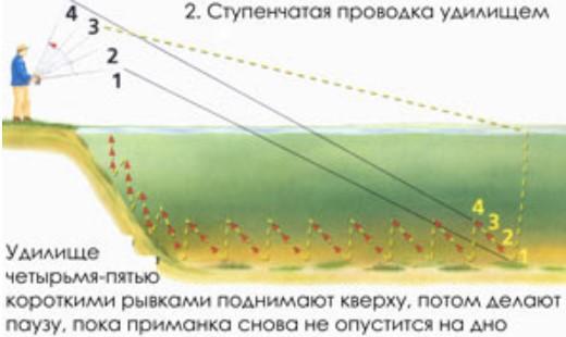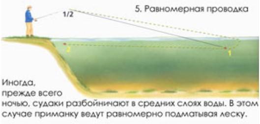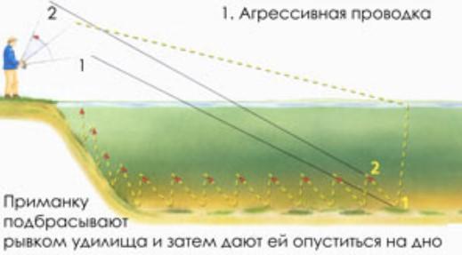 Это достигается опусканием удилища в горизонтальное положение. Не забывайте при этом подматывать леску, чтобы постоянно иметь контакт с приманкой. Такая техника проводки успешна всегда, когда рыба особенно активна. Если вода прозрачная II температура ее выше +15°С, ловите судака, щуку и окуня именно таким способом. Однако в темное время суток, при глубокой и мутной воде эффективность такой проводки снижается.