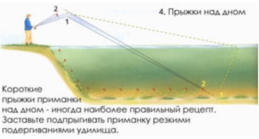 После погружения на дно с помощью быстрых, почти похожих на подсечку, подъемов удилища приманка подбрасывается вверх, в средние слои воды. Тем самым имитируются движения быстро убегающей рыбки, которая, колеблясь, снова опускается на дно.