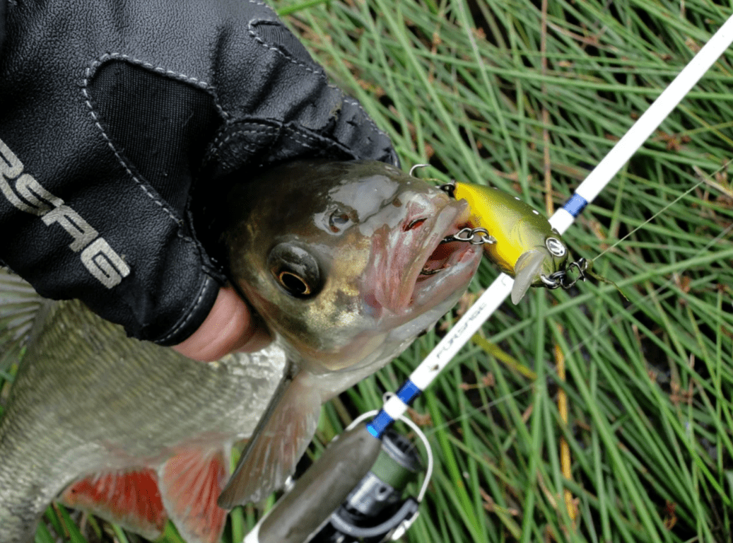 Но в тот день, две трети участка промолчали, вроде только один окунь и позарился на предложенный воблер. Рыбалка происходит с берега в высоких сапогах и очередной валун в воде, позволяет шикарно расположится между травой без постоянного риска начерпать воды в сапоги.