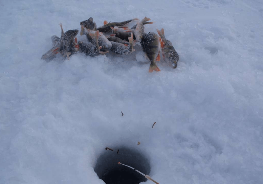 Поднаживил мотылька, опустил – тут же удар, и вывожу ещё одного хорошего окушка. Опять свежего мотылика наживил,опускаю – и опять крепкая поклёвка! Так я минут за десять поймал практически без игры семь хороших окуней. Потом в клёве наступило затишье.