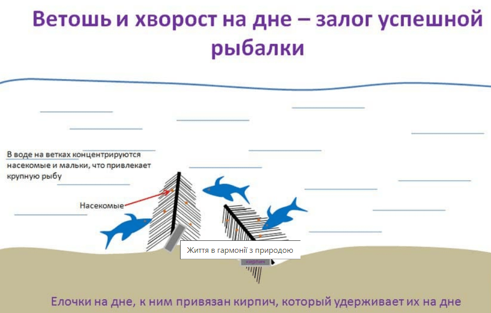 Весной, выбрав удачное глубокое место на реке, рыбаки притопили в воде старые высохшие елочки (таких много после Нового года около мест свалки мусора), веточки и т.д. Чтобы как-то зафиксировать всё это на дне, рыбаки связали высохшие деревья, привязали к ним по 2-3 кирпича и всё это поместили в воду.