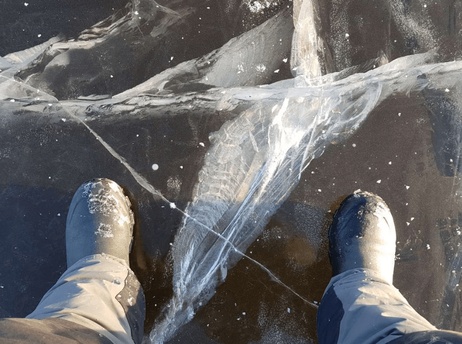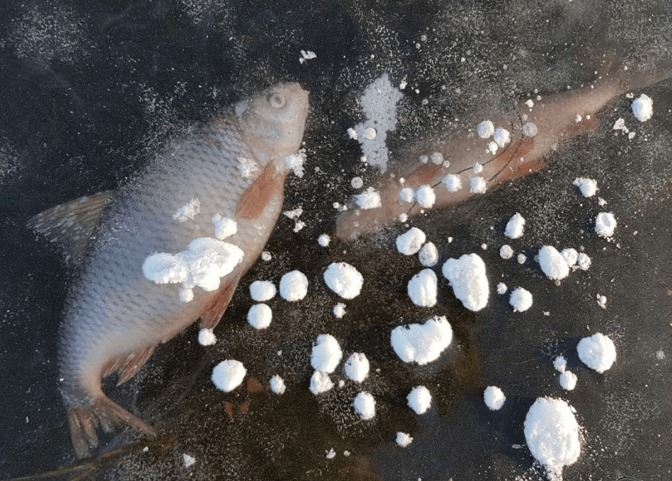 Около трёх часов дня сматываю леску. Кладу удочки в ящик и собираюсь к дому. Проходящий мимо рыбак говорит мне: «Ты сеть видел? Вон, иди, посмотри!» Иду смотреть. Буквально в десяти метрах от меня вижу печальное зрелище, которое не описать словами. Чья-то брошенная сеть, битком набитая рыбой, поднялась на поверхность и вмерзла в монолитный лёд. Так вот почему не брала сорога…