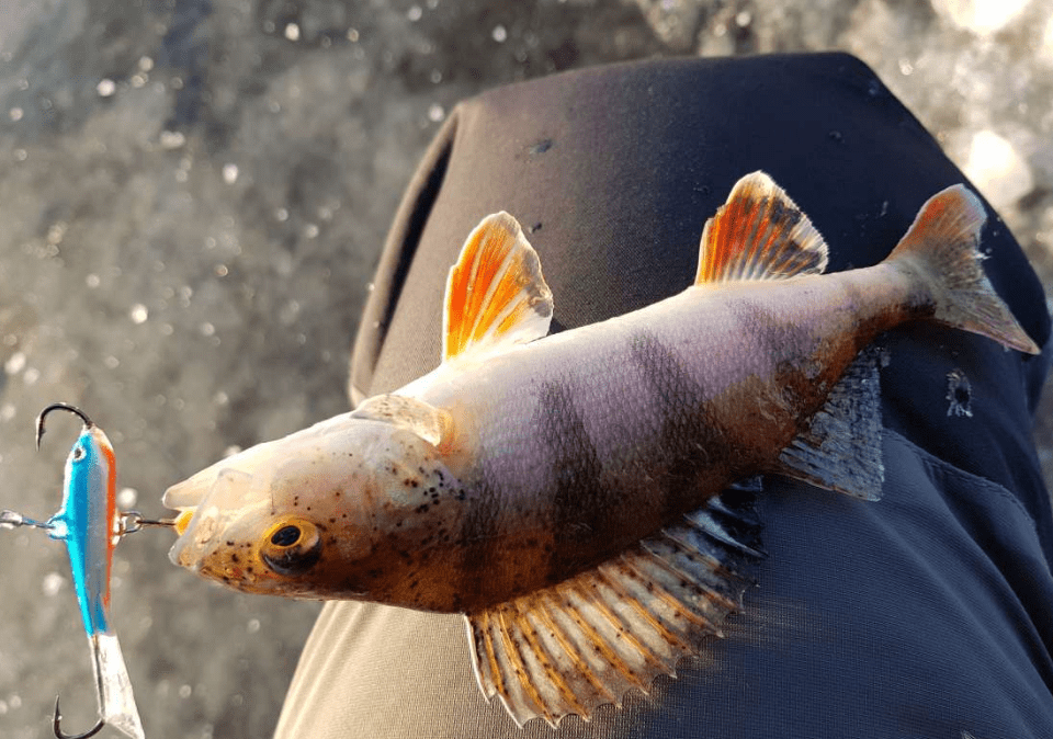 Уходим на слабое течение. Глубина в месте ловли около метра. На дне трава, очень часто случаются зацепы. Поднимаю балансир над травой, делаю взмахи. На экране эхолота поднимается линия. Бац! И у меня первый окунёк в зачёте. Сработал балансир Usami Dansa. Опускаю в лунку балансир Dansa в другой расцветке, и тут же снова поклёвка. Окунь садится уверенно, никаких прелюдий.