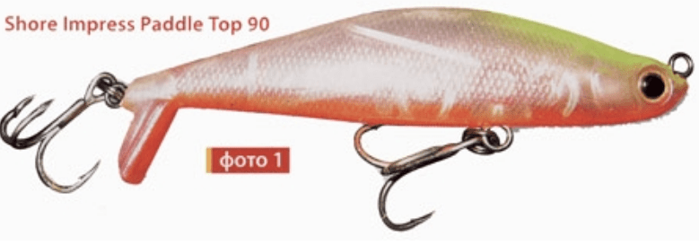 1. Shore Impress Paddle Top 90 (90 мм-10,5 г, фото 1). Отличный воблер, но подходит с оговорками. Удельный вес велик, летает далеко, но имеет своеобразную балансировку- центр тяжести посередине. Если нет ветра — все хорошо, но небольшой ветер сбоку или в лоб — и начинаются проблемы с точностью.