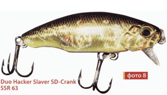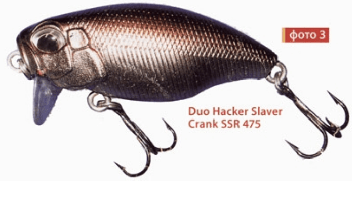 3. Duo Hacker Slaver Crank SSR 475 (47,5 мм — 6 г, фото З). Приманки этой японской фирмы (очень реалистичные — и при этом весьма недорогие) не очень пока известны в России. Данный воблерок, несмотря на свои скромненькие размеры, прекрасно летает.