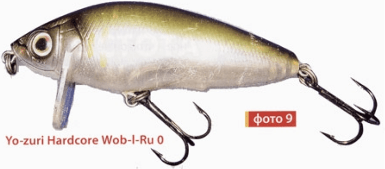 6. Yo-zuri Hardcore Wob-I-Ru 0 (фото 9). Широко распространенный, всеми любимый супермелководный крэнк. Важнейшее отличие от братцев Duo — это то, что он уходит глубже них при приводнении — и на экстремальном расстоянии от поверхности до травы или тины может нацеплять всякую пакость на задний крючок.