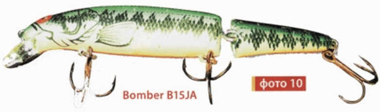 7. Bomber B15JA (фото 10). По полетным характеристикам от своего братца В15А отличается разительно. Все дело в том, что хвостовая часть у него — тонущая, а соответственно — тяжелая. За счет этого и хороший полет, и мощная «игра», и аппетитная пауза. Правда, глубоковато уходит при приводнении, что ограничивает применение полуметром глубины в месте заброса.