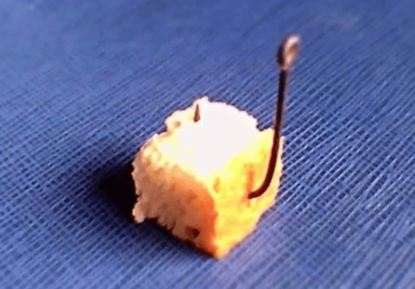 Дома корку хлеба режу на кубики в размере 1х1х1 см и подсушиваю всё это на сквозняке для того, чтобы хлеб подсох и лучше держался на крючке. При насаживании кусочков хлеба на крючок обязательно прокалываю 1 или 2 раза саму корочку хлеба для более прочного удержания его на крючке.