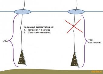 На дне кормушка постоянно должна находиться в вертикальном положении. Для этого следует хорошо натянуть лесу и положить на дно груз.