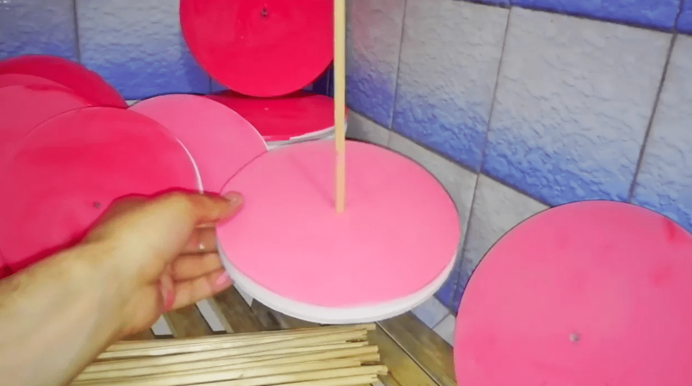 Сверху штыря делают небольшую прорезь, где будет крепиться шнур. Снизу штырь имеет вид диска или небольшого шарика, выкрашенного в цвет диска. По окружности приспособления делают выемки, куда наматывают леску с крючками.