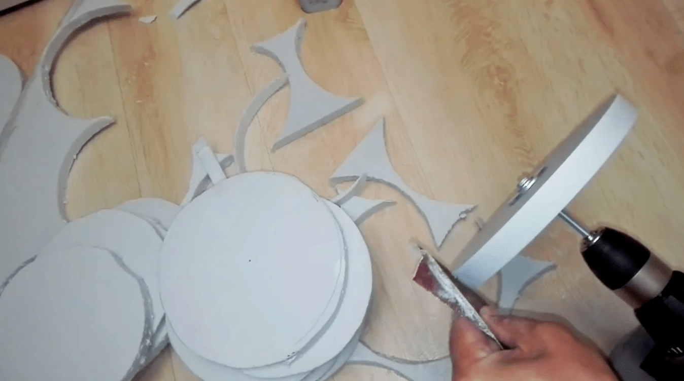 Материал размечается на деталь нужной формы циркулем или подходящим предметом. Вырезание осуществляется острым ножом или ножовкой, чтобы получились плавные линии, происходит обработка краев наждачкой.