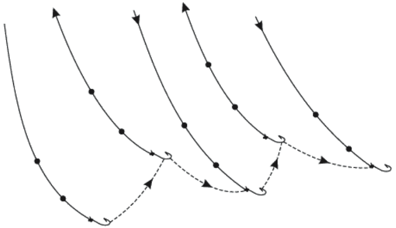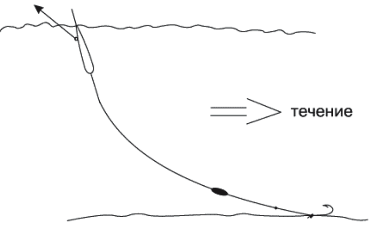 Леска во время падения оснастки будет находиться в натянутом состоянии. Течение сносит оснастку, и одновременно с этим крючок и грузила будут опускаться ко дну по определенной дуге, леска на всех участках оснастки опять же будет натянута. Приманка достигнет дна по сложной дуге со скоростью, близкой к скорости естественно падения, и поклевка может произойти еще до касания дна.