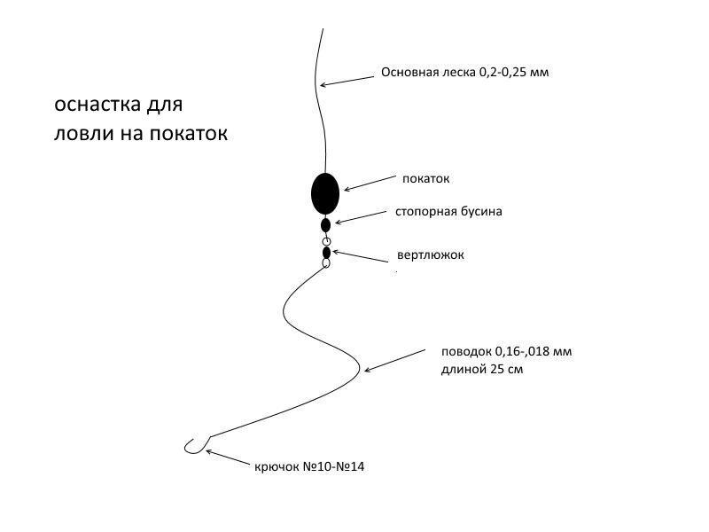Для этого способа лова нужно иметь «покаточную» снасть, которая состоит из удильника (длиной около метра), небольшой инерционной катушки с леской 0.2 мм. На кончик удильника можно надеть кивок, для лучшего ощущения поклёвки.