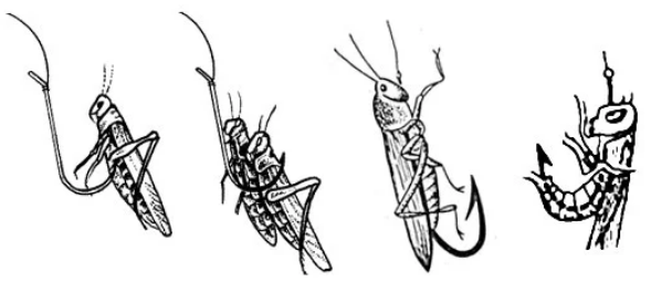 С опытом каждый рыболов начинает понимать, почему рыбе удается стащить с крючка кузнечика и безнаказанно уйти. Если завести крючок в нижней части тельца и вывести его через головогрудь, насекомое будет надежно зафиксировано и при этом останется живым, а значит, более привлекательным.