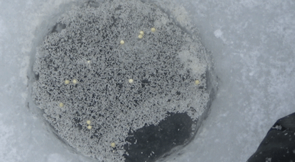 На дне прикормка образует привлекательное пятно, опустив мормышку на которое и происходит ужение. С этой прикормкой наиболее эффективно ужение со дна. Хотя можно ловить играя безмотылкой или мормышкой с наживкой.