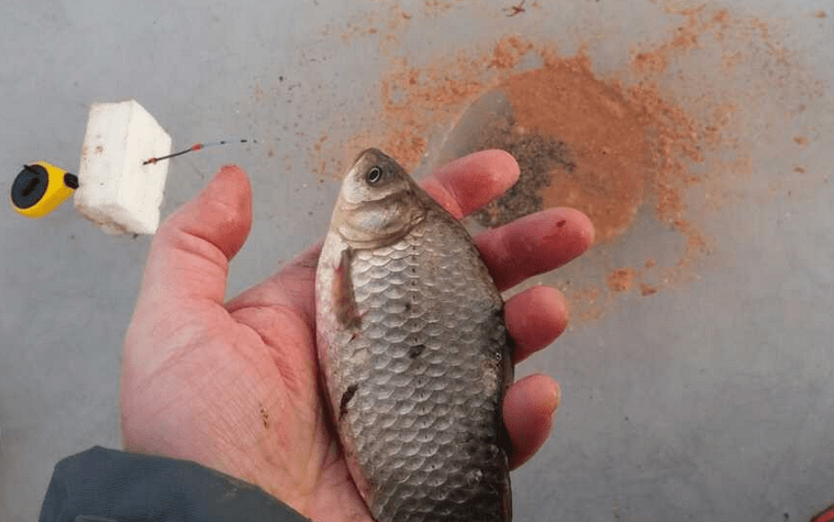 Небольшой, но вполне зачетный для зимней рыбалки карасик показал, что моя ставка на меляки была верной. Взвесив все за и против, я решил прикормить лунку, принесшую карасевую поклевку. Хотелось удержать рыбу под лункой. Снова на крючок был нанизан компактный «бутерброд» из опарика и мотыля.