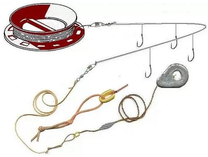 Поводки все с крючками к леске закрепляют «петля в петлю». Еще применяют вертлюжок и застежку. Так можно быстро освободить рыбу с поводком и привязать второй.