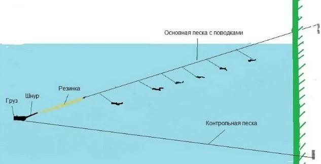 Колышки вбиваются на берегу в 2-2.5 м друг от друга. Саму леску проводят в кольцо груза и последний забрасывают. А концы лески запускают в кольца – получается своеобразный круг. Привязывают поводки с крючкам и наживкой и, потягивая, отпускают в реку к грузилу. Устанавливают любое сигнальное устройство.