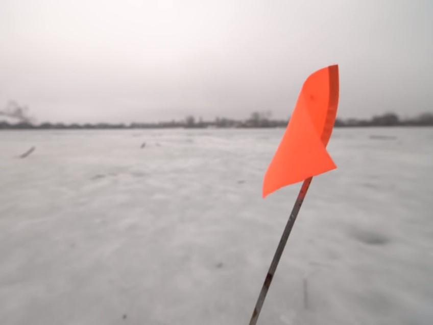 Есть ребята экспериментируют с флуоресцентно-салатовым, красным, я лично пробовал разные варианты по тканям, делал одинакового цвета флажки, отходил на расстояние, выставлял жерлицы в ряд и смотрел какой цвет для меня комфортнее на разных типах поверхности – это заснеженный лёд, чистый лёд, белого цвета, лёд темного цвета, самый яркий и самый заметный для меня вариант был – это флуоресцентно-оранжевый.