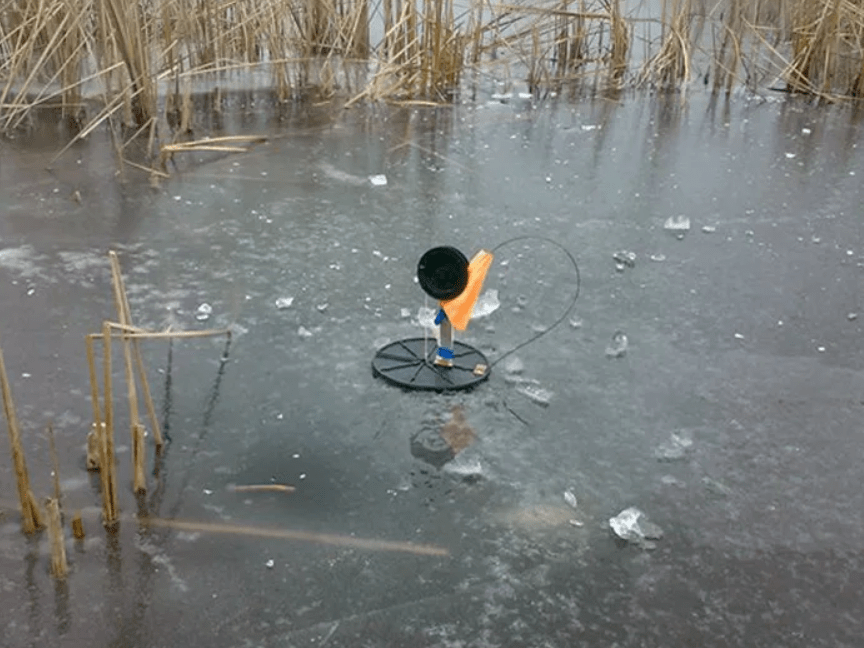 Выбирать место для установки жерлиц следует «на глаз» — заросли камыша, тростника и иной растительности выдают весьма неплохие для ловли места. Именно рядом с ними и следует производить ловлю. Лунки располагаются на расстоянии 10-15 метров одна от другой.