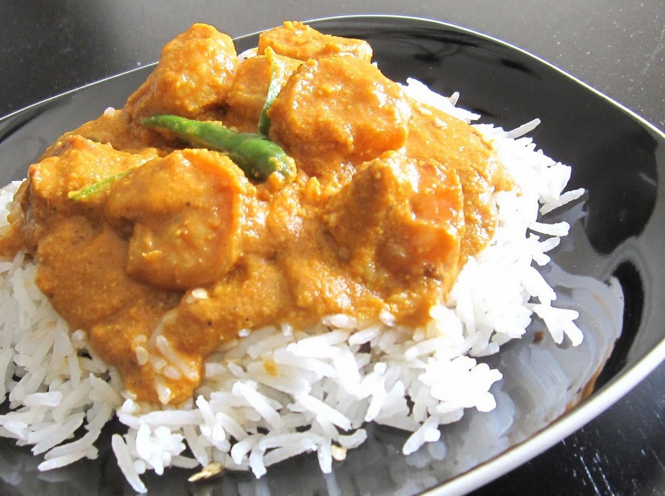 Муку пассеруют в масле, добавляют порошок «карри» и вводят в сок, в котором припускалась рыба. Готовый соус протирают, заправляют сливочным маслом и процеживают через сито. Припущенную рыбу укладывают на рис, заливают соусом, посыпают мелко нашинкованной зеленью