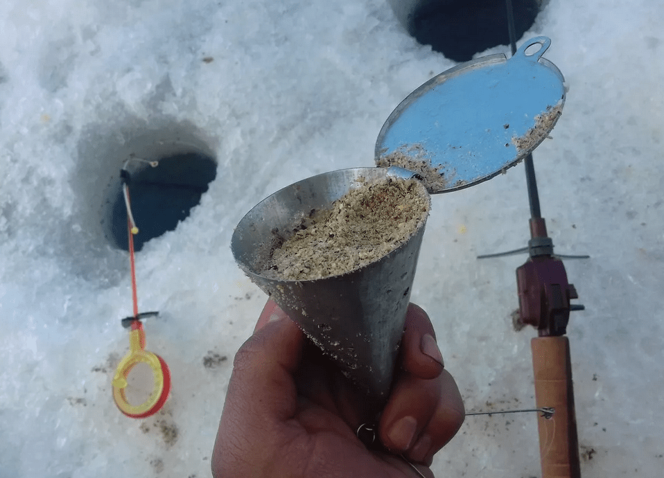 Этот способ целесообразно применять при ловле на небольшой глубине и при отсутствии сильного течения. В противном случае легкая «сыпучка» не сможет опуститься на дно, и рыба будет тянуться за ней, отплывая от места ловли. Зато на стоячей воде таким способом можно создать столб прикормки в толще воды от поверхности до льда, и даже опустить рыбу на дно.
