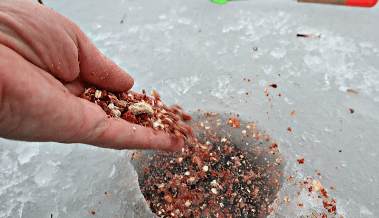 Прикормка просто засыпается в лунку, после чего медленно опускается на дно. Таким способом издавна приваживают сорожку, густеру и леща. Еще наши деды сыпали в лунку манную крупу и сухари, удерживая таким способом рыбу под лункой.