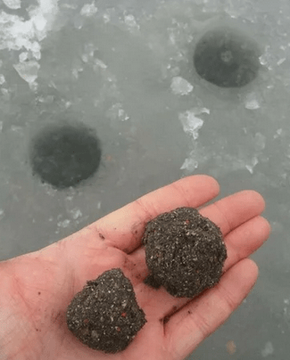 В каждую лунку опускается два-три небольших шара, размером с куриное яйцо. Важным моментом является цвет прикормки. Желательно, чтобы прикормка контрастно не выделялась на дне. Нередко лучше показывает себя прикормка темного цвета.