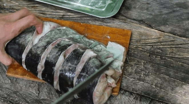 Для приготовления лучше взять не крупного молодого сома . Его необходимо промыть, удалить лишнюю влагу,после отрезать голову, плавники и хвост. Все обрезки, можно использовать для приготовления ухи. Далее нужно нарезать тушку на стейки.