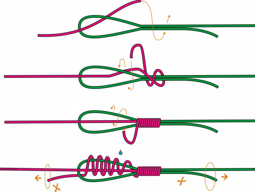 Его преимущество в том, что после затягивания узла — концы лески направлены по направлению основной леске, а не перпендикулярно ей. Такой узел не позволит леске во время заброса зацепляться за узелок.