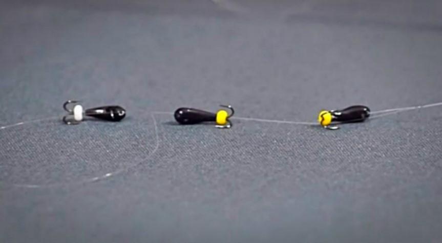 При ловле на течении следует ловить на крупные мормышки, но они не всегда нравятся рыбе. В таком случае я использую паровоз из двух чертиков.