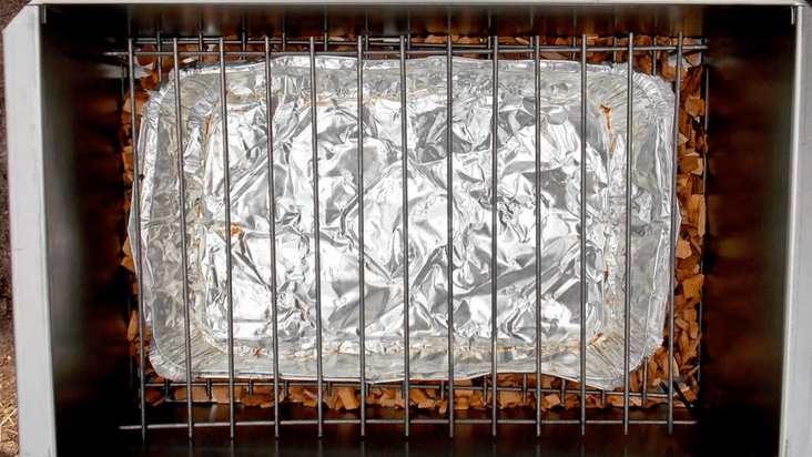 Также стоит учитывать то, что поддон из фольги не должен касаться щепы, поэтому наложив щепу стоит под поддон подложить что-либо, дабы приподнять поддон. Я для этого использую 3 обрезка профиля, между которыми накладываю щепу. Таким образом щепа не касается фольги, поэтому отлично дает дым и не прожигает поддон с жиром.
